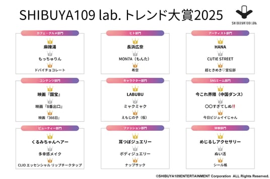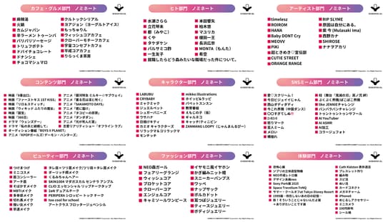 今年は「カフェ・グルメ部門」「ヒト部門」「アーティスト部門」「コンテンツ部門」 「キャラクター部門」 「SNSミーム部門」「ビューティー部門」「ファッション部門」「体験部門」の9部門を設置。ノミネート項目についてはSHIBUYA109 lab. MATEに所属する10名の高校生・大学生が選考委員となり、ノミネート選出を行うトレンド大会議を経て決定しています。
