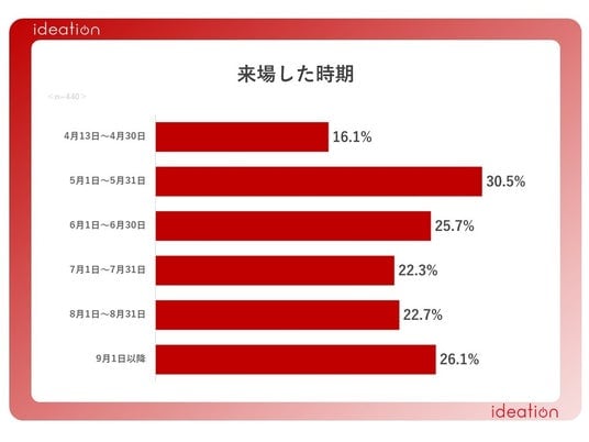 4月は、開催から18日間のみと、半月ほどの開催期間だったものの、来場者の割合は16.1%と高く、会期前半での来場者の割合が高めであったことがわかりました。
