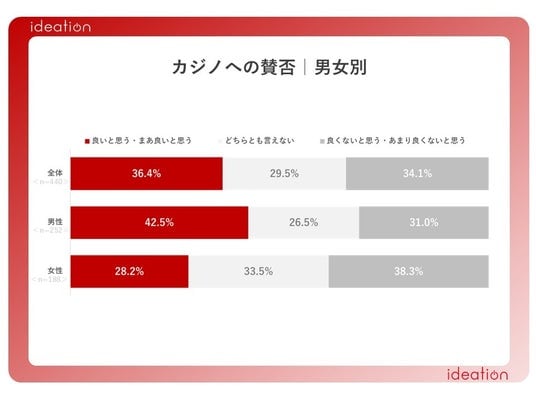 否定的な意見の多かったカジノについて、男女別での傾向を見たところ、男性の42.5%が「良いと思う・まあ良いと思う」と回答したのに対し、女性は28.2%と約15ptの差が生まれており、女性の方がカジノに対してマイナスの印象を持っている傾向が見られました。