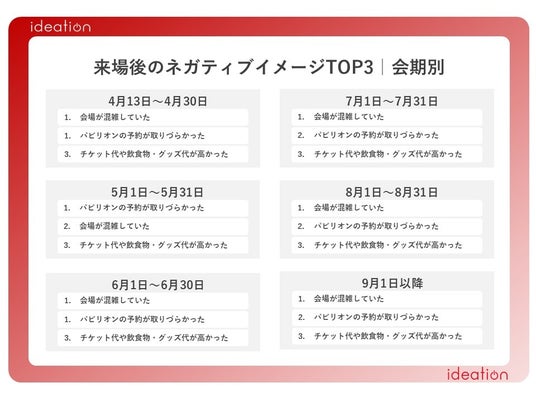 ネガティブイメージについては、「会場が混雑していた」「パビリオンの予約が取りづらかった」「チケット代や飲食物・グッズ代が高かった」が、すべての会期で下位3位を占めており、来場した会期に関わらず、会場の混雑や出費の負担が不満点として共通していたようです。
