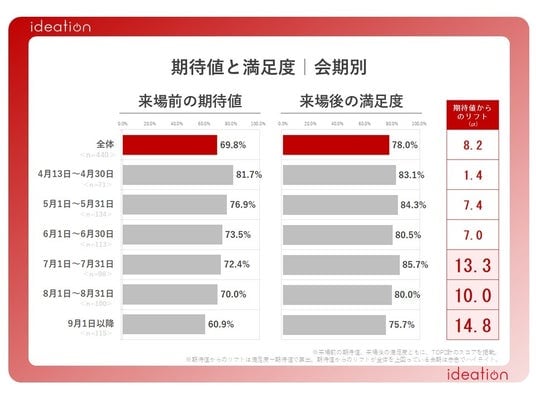 来場前の期待値から来場後の満足度への上昇率についても、すべての会期で満足度が期待値を上回っており、特に7月以降の会期後半は、満足度が期待値を10Pt以上上回る結果となりました。会期が進むにつれ、SNSやメディアなどを通じて会場の様子や混雑具合などを事前に把握でき、一種の疑似来場体験のような状況が生まれたことで、良くも悪くも来場前の期待値が下がっていた可能性が考えられます。