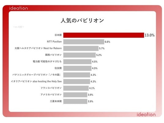 「最も魅力的だったパビリオン」について聴取したところ、日本館が13.0%と最も評価が高く、2位以下に大差をつける結果となりました。