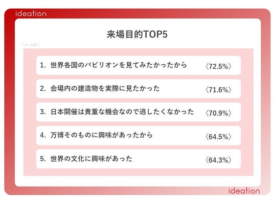 大阪・関西万博の来場目的トップは「世界各国のパビリオンを見てみたかったから」72.5%、次いで「会場内の建造物を実際に見たかった」71.6%、「日本開催は貴重な機会なので逃したくなかった」70.9%と続きました。