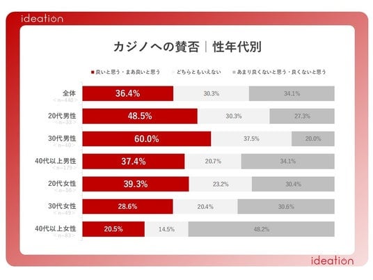 性年代別で見ると、20代男性では5割近く、30代男性では6割が「良いと思う・まあ良いと思う」と肯定的に捉えており、若年男性ではカジノ肯定派が多い結果となりました。