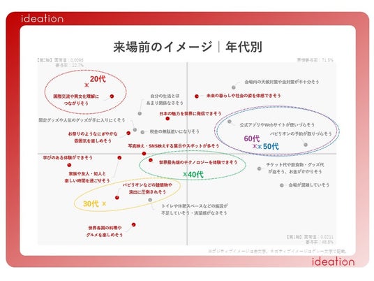 一方、50代~60代では、「パビリオンの予約が取りづらそう」「公式アプリやWebサイトが使いづらそう」などネガティブなイメージワードが近くに位置しており、来場前の期待や不安に年代差が見られました。