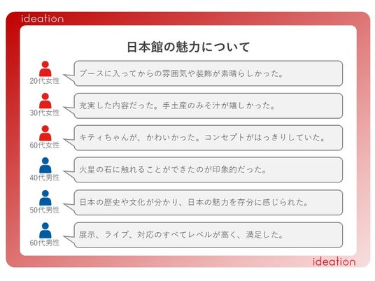 「キティちゃんが登場する」「火星の石に触れられる」といったインパクトのある展示が設けられていたことや、みそ汁の手土産が配布されたことなども、人気の高い要因となっていたようです。