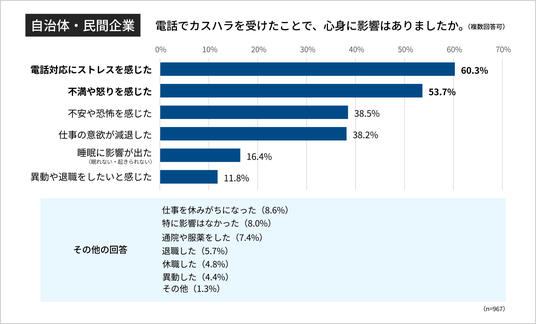 カスハラ被害を受けた人の6割が「電話対応にストレス」を感じており、不安・怒り・仕事への意欲低下・睡眠障害など、心身両面に影響が及んでいます。特に、自治体では市民対応という公共性の高い業務で逃げ場が少なく、ストレスが慢性化しやすい可能性も考えられます。