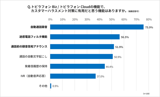 また、「トビラフォン Biz」および「トビラフォン Cloud」のユーザーがカスハラ対策に有用だと感じている機能の1位は自動通話録音でした。そのほか、迷惑電話フィルタ機能、通話前の録音告知アナウンス、通話の自動文字起こしなど、当サービスが搭載する様々な機能がカスハラ対策に活用されています。
