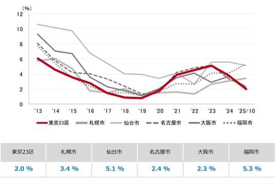 三幸エステート株式会社(本社:東京都中央区、取締役社長:福島正二郎)は、2025年10月度の東京都心5区(千代田区、中央区、港区、新宿区、渋谷区)および全国6大都市(東京、札幌、仙台、名古屋、大阪、福岡)の大規模ビル※1のマーケットデータをまとめた「オフィスマーケット2025年11月号」を公表します。