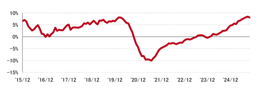 募集賃料の対前年同月比は、2024年2月から21ヵ月連続でプラスとなった。2025年9月のプラス幅は8.4%で、コロナ禍前の直近のピークであった2020年3月の水準を上回っている。対前年同月比のトレンドは比較的安定しているため、上昇傾向は今後も続くと考えられる。
