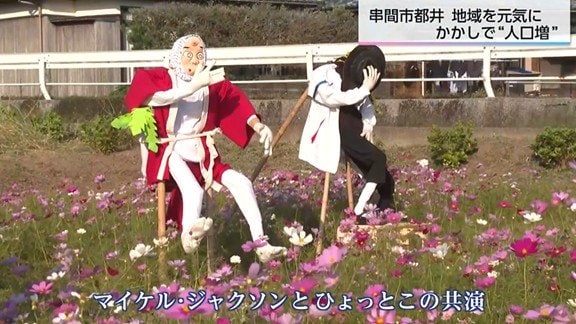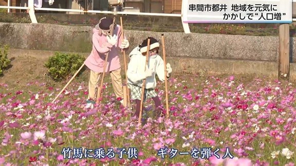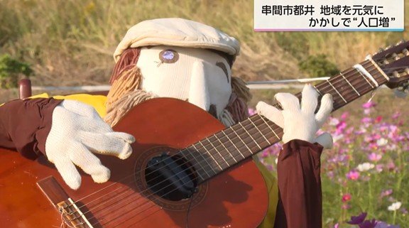 一方、串間市都井岬近くの国道448号沿いにある、都井地区あかり会が植えたコスモス畑には13体の個性豊かな案山子が登場した。