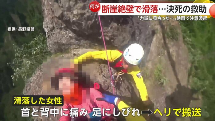 女性は滑落により、首と背中を痛めたうえ、足にしびれも出ていたため、ヘリで搬送された。
