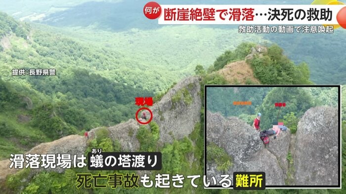 現場は、尾根にある「蟻(アリ)の塔渡り」と呼ばれるルート。幅が極端に狭く、過去には死亡事故も起きている難所だ。