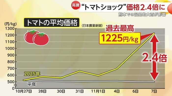 日本農業新聞によると、トマトの平均価格が1kgあたり1225円となり、過去最高を更新。平年と比べても、2.4倍に上昇しているという。