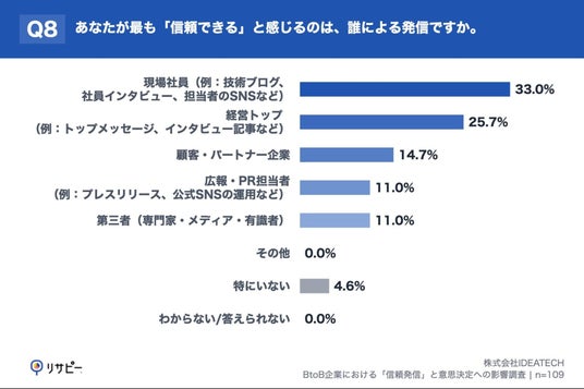 「Q8. あなたが最も「信頼できる」と感じるのは、誰による発信ですか。」(n=109)と質問したところ、「現場社員(例:技術ブログ、社員インタビュー、担当者のSNSなど)」が33.0%、「経営トップ(例:トップメッセージ、インタビュー記事など)」が25.7%という回答となりました。
