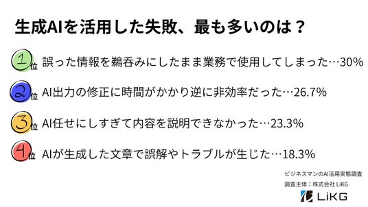 また、最も多かった失敗は「誤情報を鵜呑みにしたまま業務で使用してしまった」(30%)。 次いで「AI出力の修正に時間がかかり逆に非効率だった」(26.7%)、「AI任せにしすぎて内容を説明できなかった」(23.3%)が続きました。