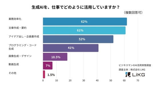 生成AIの活用内容として最も多かったのは「業務効率化(時間短縮)」で62%。次いで「文章作成・要約」(61%)、「アイデア出し・企画書作成」(52%)が上位に挙がりました。また「プログラミング・コード生成」(41%)も一定数存在し、IT部門に限らず幅広い職種で活用が進んでいることが分かります。 一方、「画像生成・デザイン」(18.5%)、「動画生成」(7%)はまだ限定的でした。
