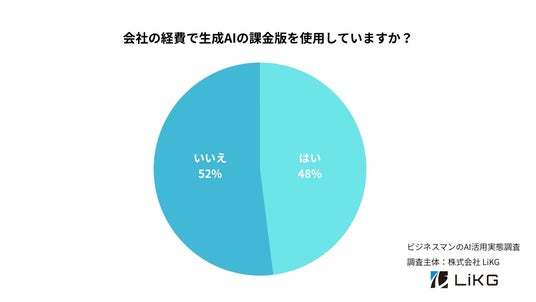 「会社の経費で生成AIの課金版を使用していますか?」という問いに対しては、「使用している」と回答した人は48%、「無料版のみ利用している」が52%と、ほぼ半数に分かれました。企業レベルでもAI活用の環境整備が進みつつあるものの、