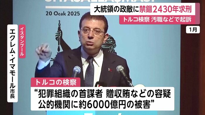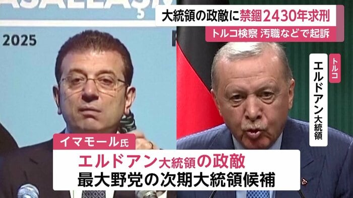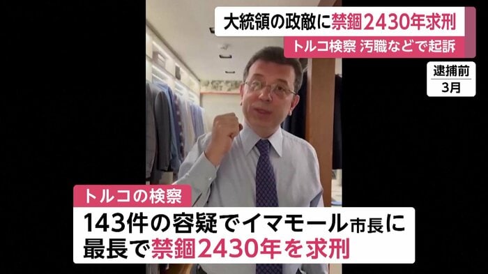 トルコの検察は11日、エルドアン大統領の政敵とされる最大都市イスタンブールのイマモール市長を起訴し、禁錮2430年を求刑した。