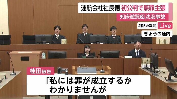 桂田被告は2022年4月、悪天候が予想される中、運航管理者として出航しないよう船長に指示せず遊覧船「KAZU1」を沈没させて乗客乗員20人が死亡、6人が行方不明になる事故を起こしたとして、業務上過失致死の罪に問われている。