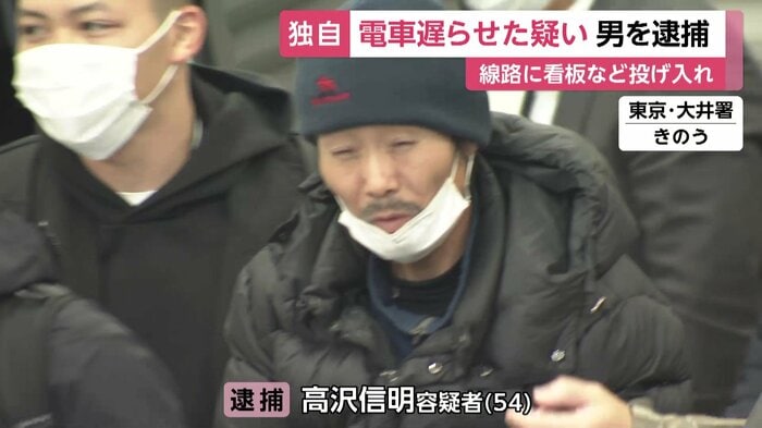 高沢信明容疑者は9月、東京・品川区のJR大井町駅前にある橋の上から、三角コーンや金属製の看板を線路へ投げ込み、電車を遅らせた疑いがもたれている。