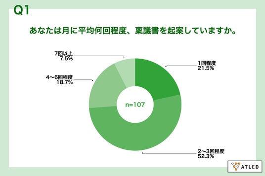 「Q1.あなたは月に平均何回程度、稟議書を起案していますか。」(n=107)と質問したところ、「1回程度」が21.5%、「2~3回程度」が52.3%という回答となりました。