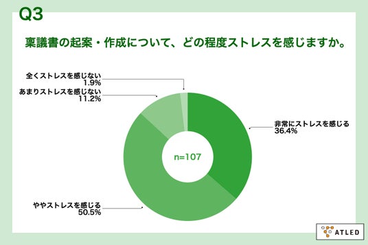 「Q3.稟議書の起案・作成について、どの程度ストレスを感じますか。」(n=107)と質問したところ、「非常にストレスを感じる」が36.4%、「ややストレスを感じる」が50.5%という回答となりました。