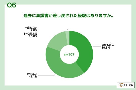 「Q6.過去に稟議書が差し戻された経験はありますか。」(n=107)と質問したところ、「何度もある」が39.3%、「数回ある」が41.1%という回答となりました。