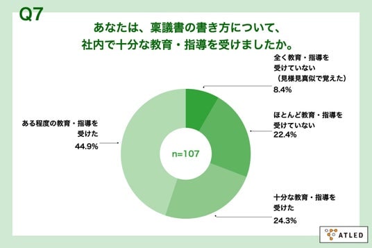 「Q7.あなたは、稟議書の書き方について、社内で十分な教育・指導を受けましたか。」(n=107)と質問したところ、「ほとんど教育・指導を受けていない」が22.4%、「全く教育・指導を受けていない(見様見真似で覚えた)」が8.4%という回答となりました。