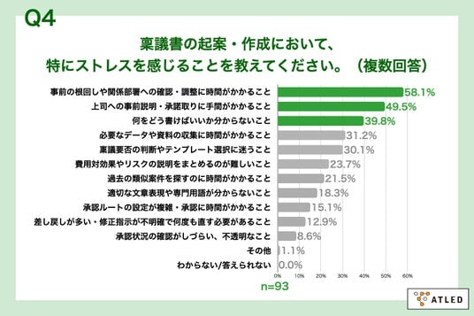 Q3で「非常にストレスを感じる」「ややストレスを感じる」と回答した方に、「Q4.稟議書の起案・作成において、特にストレスを感じることを教えてください。(複数回答)」(n=93)と質問したところ、「事前の根回しや関係部署への確認・調整に時間がかかること」が58.1%、「上司への事前説明・承諾取りに手間がかかること」が49.5%、「何をどう書けばいいか分からないこと」が39.8%という回答となりました。