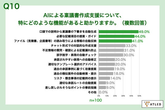 Q9で「ぜひ利用したい」「利用したい」と回答した方に、「Q10.AIによる稟議書作成支援について、特にどのような機能があると助かりますか。(複数回答)」(n=100)と質問したところ、「口頭での説明から稟議書の下書きを自動生成」が49.0%、「必要な記載項目の提案・ガイド」が44.0%、「ファイル(見積書、企画書等)の読み取りによる情報の自動反映」が41.0%という回答となりました。