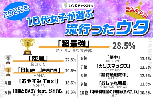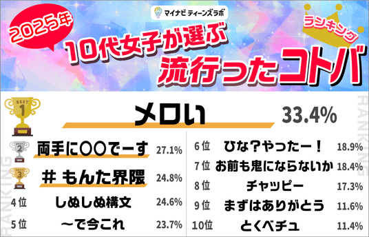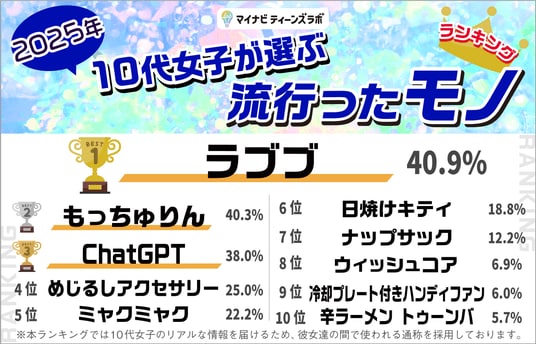 株式会社マイナビ(本社:東京都千代田区、代表取締役 社長執行役員:土屋芳明)が運営する、ティーンのマーケティングやリサーチを行う『マイナビティーンズラボ』(URL:https://cm-marketinglab.mynavi.jp/teenslab/)は、「2025年10代女子が選ぶトレンドランキング」を発表しました。