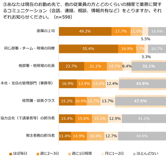 また、普段のコミュニケーションにおいてほぼ毎日コミュニケーションを取るのは、「直属の上司」「同じ部署・チーム・現場の同僚」がそれぞれ49.2%、55.4%と半数近くなったのに対し 「他部署・他現場の社員」では32.1%、「本社・支店の管理部門(事務等)」では43.8%、「経営層・役員クラス」では47.5%が「ほとんどない」と回答しました。