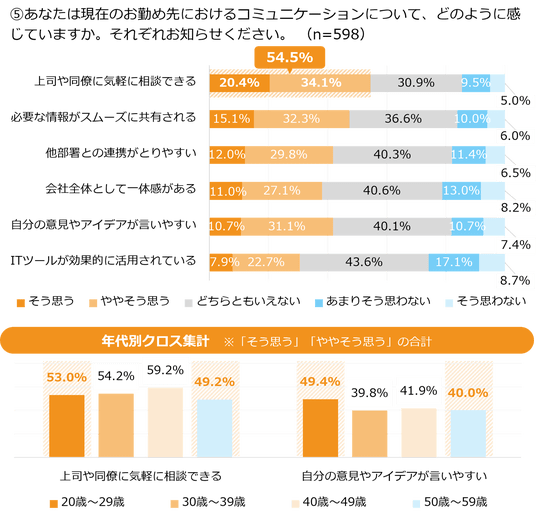 コミュニケーションのしやすさについて「上司や同僚に気軽に相談できる」という質問に対し「そう思う」「ややそう思う」と回答した人は54.5%でした。年代別に見ると50代では49.2%となり半数を下回りました。