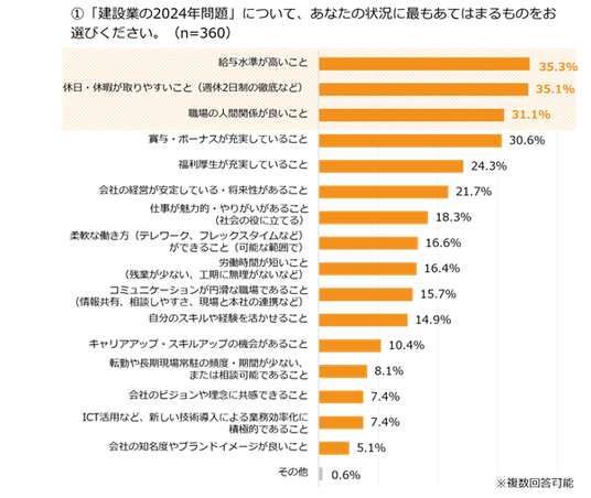 転職先を選ぶ基準は、待遇や会社の将来性に加え、職場の人間関係も重視されています。自由回答では、建設業特有の働き方や教育の問題、下請け会社とのコミュニケーションのあり方、女性が活躍できる環境整備を求める声も聞かれました。具体的には「もっとコミュニケーションを取ったほうが職場の雰囲気がより良くなると思う」や「みんなが忙しくてコミュニケーションをとる時間がない。残業が定着しており、定時に帰りづらい」などです。