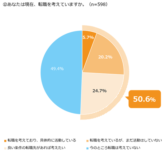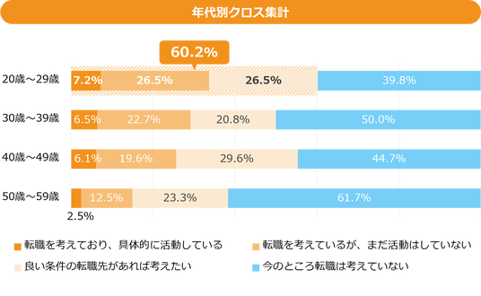 現在の転職意向を聞くと50.7%が転職を考えていることがわかりました。また年代別でみると20代では60.2%が転職を検討している結果となりました。