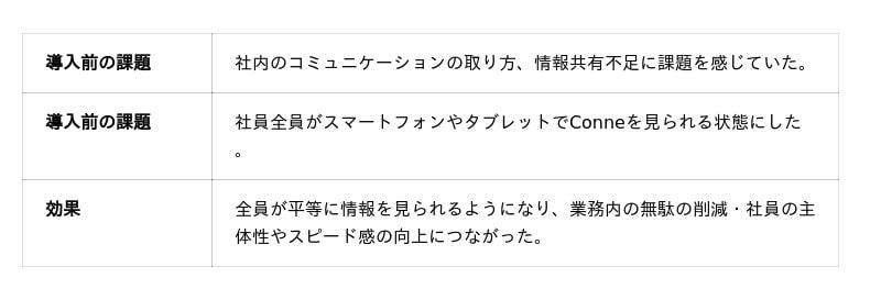 下記は、建設業向けコミュニケーションサービスであるConne(コンネ)を導入し、日々の業務を見える化することで、チーム力を向上させた成功事例です。