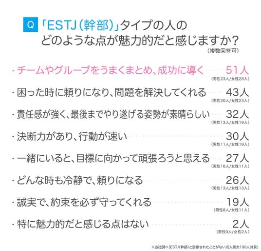 続いて、「ESTJ(幹部)と診断されたことがない成人男女100人」を対象に、ESTJ(幹部)のどのような点が魅力的だと感じるかについて、アンケート調査を実施しました。