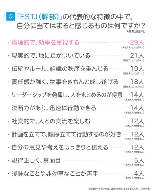 さらに細かくESTJ(幹部)の性格について調査するために、先ほどのアンケートとは別に、「ESTJ(幹部)と診断された経験のある成人男女100人」を対象に実施したアンケートの結果を紹介します。