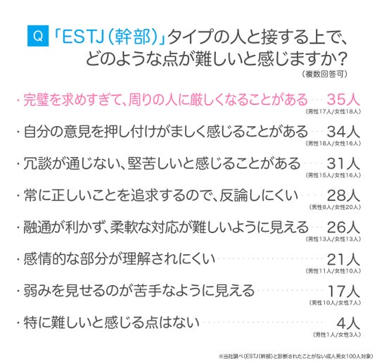 「ESTJ(幹部)と診断されたことがない成人男女100人」を対象に、ESTJ(幹部)の難しいと感じる点についても尋ねてみました。