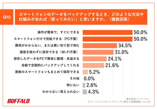 「Q10.スマートフォンのデータをバックアップするとき、どのような方法や仕組みがあれば「使ってみたい」と思いますか。(複数回答)」(n=116)と質問したところ、「操作が簡単で、すぐにできる」が50.0%、「スマートフォンだけで完結できる(PC不要)」が50.0%、「費用がかからない、または買い切り型で済む」が34.5%という回答となりました。
