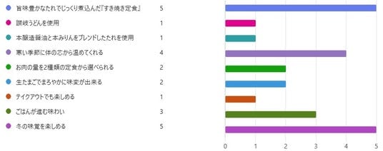 最も多くの票を集めたのは「旨味豊かなたれでじっくり煮込んだ『すき焼き定食』」というポイントでした。2位は『寒い季節に体の芯から温めてくれる』、『冬の味覚を楽しめる』、3位は『お肉の量を2種類の定食から選べられる』、『生たまごでまろやかに味変が出来る』、『ごはんが進む味わい』