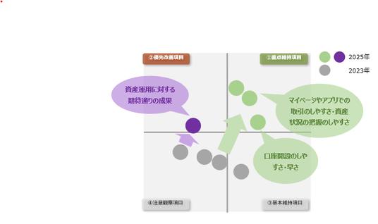 ネット証券全体におけるNPS上昇の要因を分析したところ、2023年と比較して2025年には「口座開設のしやすさ・早さ」や「マイページやアプリでの取引のしやすさ」、「マイページやアプリでの資産状況の把握のしやすさ」の満足度が向上し、かつロイヤルティへの影響度が高まりました。「資産運用に対する期待通りの成果」の満足度もやや向上しており、主要な株価指数が上昇基調にある中、マイページやアプリのCXの改善がみられたことが、ネット証券のNPSが上昇した一因とみられます。