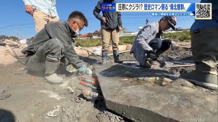 今回の発掘を手がけたのは、地元の有志でつくる「庄原化石集談会」。クラウドファンディングで約230万円を集め、侵食や流失を防ぐため掘り出しに踏み切った。