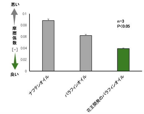 *2 花王の研究所にて、Ball on Disk、Temp. 40℃、Ball Load 50N、SRR 50%、Speed 300mm/sの条件下でMTM(Mini-Traction Machine)で測定。