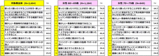 調査の結果、プログラム継続の目的は「歌ったり踊ったりすることが好き・楽しい」(69.2%)がトップで、音楽を通じた「気分転換・息抜き」(62.7%)や仲間との交流を求め、アクティブな生活を送るシニア像が浮かび上がりました。