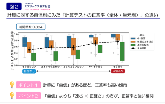 計算の自信とテストの正答率にも相関がありました。しかし、解答速度などと比べると、その影響は限定的でした。そのため、テストの正答率や解答速度などの客観的な計算力の高さが、生徒の主観的な「計算への自信」へとつながっている可能性があります。