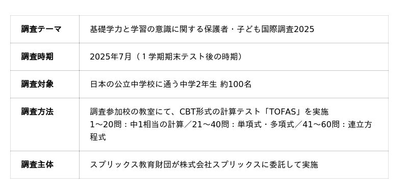 公益財団法人 スプリックス教育財団(本部:東京都渋谷区/代表理事:常石 博之)は、基礎学力に対する意識の現状を把握することを目的に、「基礎学力と学習の意識に関する保護者・子ども国際調査2025」を実施しました。第4回目の今回は、CBT形式の計算テスト(TOFAS)のデータ分析の結果についてご報告します。今回の報告での分析対象者は、日本のある公立中学校に通う中学2年生約100名です。解答時間40分・問題数60問(うち最初の20問が中学1年生に学習する内容、残り40問は今年度1学期に習った内容)の計算テスト(TOFAS)のデータを分析した結果、以下の3点が明らかになりました。