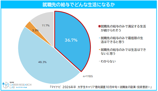 学生に「就職先の給与によってどのような生活ができると思うか」を聞くと、「満足する生活が続けられそう」と回答した割合は36.7%と、約3人に1人だった。また、「最低限の生活はできると思う」割合は48.3%と約半数だった。