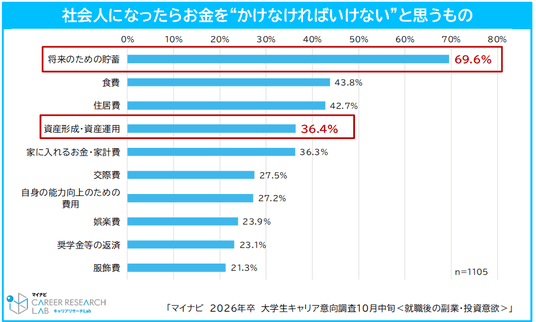 社会人になった際に「お金を“かけなければいけない”と思うもの」について聞いたところ、最も多かった回答は「貯蓄(69.6%)」であった。また「資産形成・資産運用(36.4%)」をあげる学生も3人に1人と、資産形成への意識は決して低くないことがわかる。